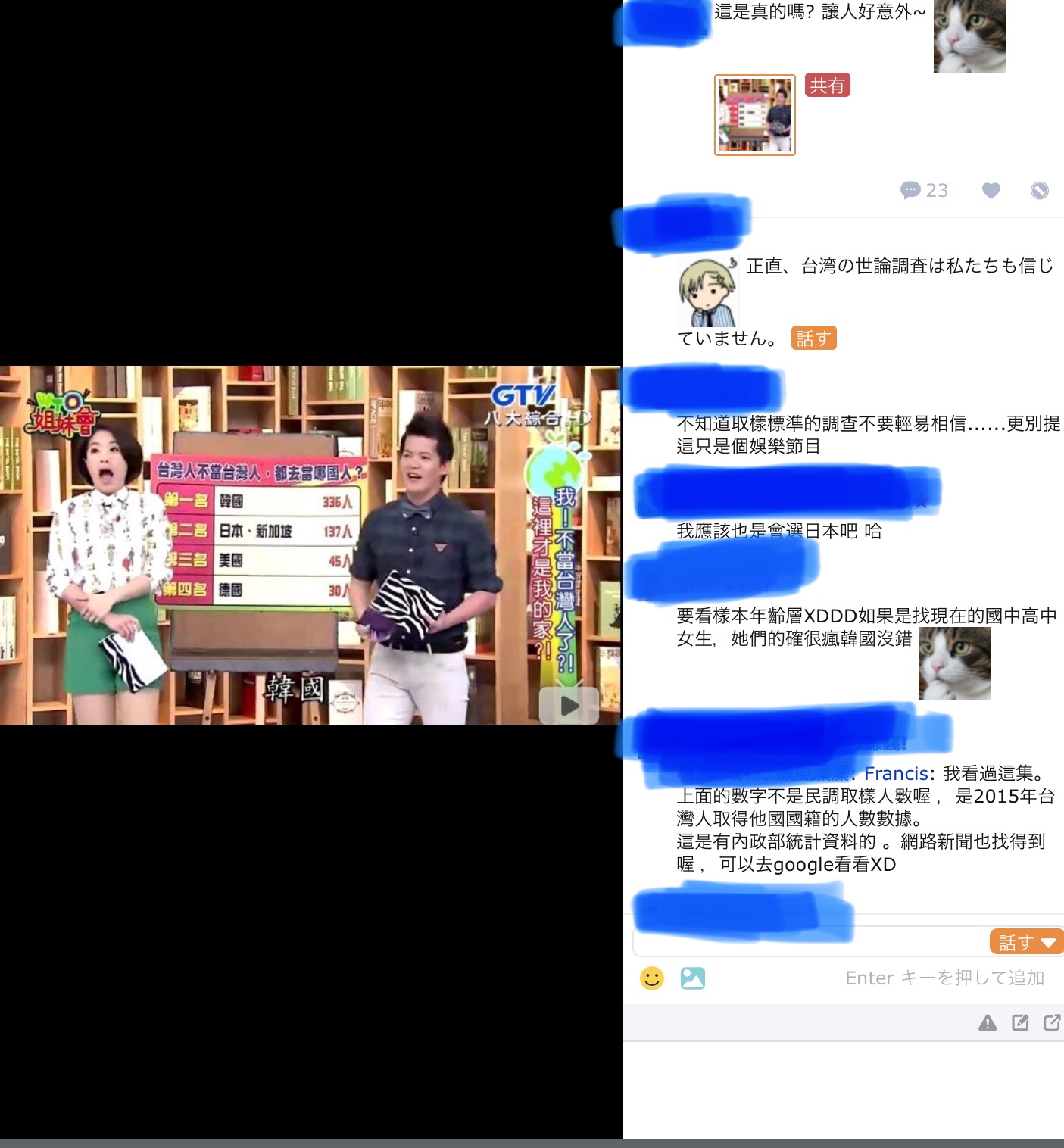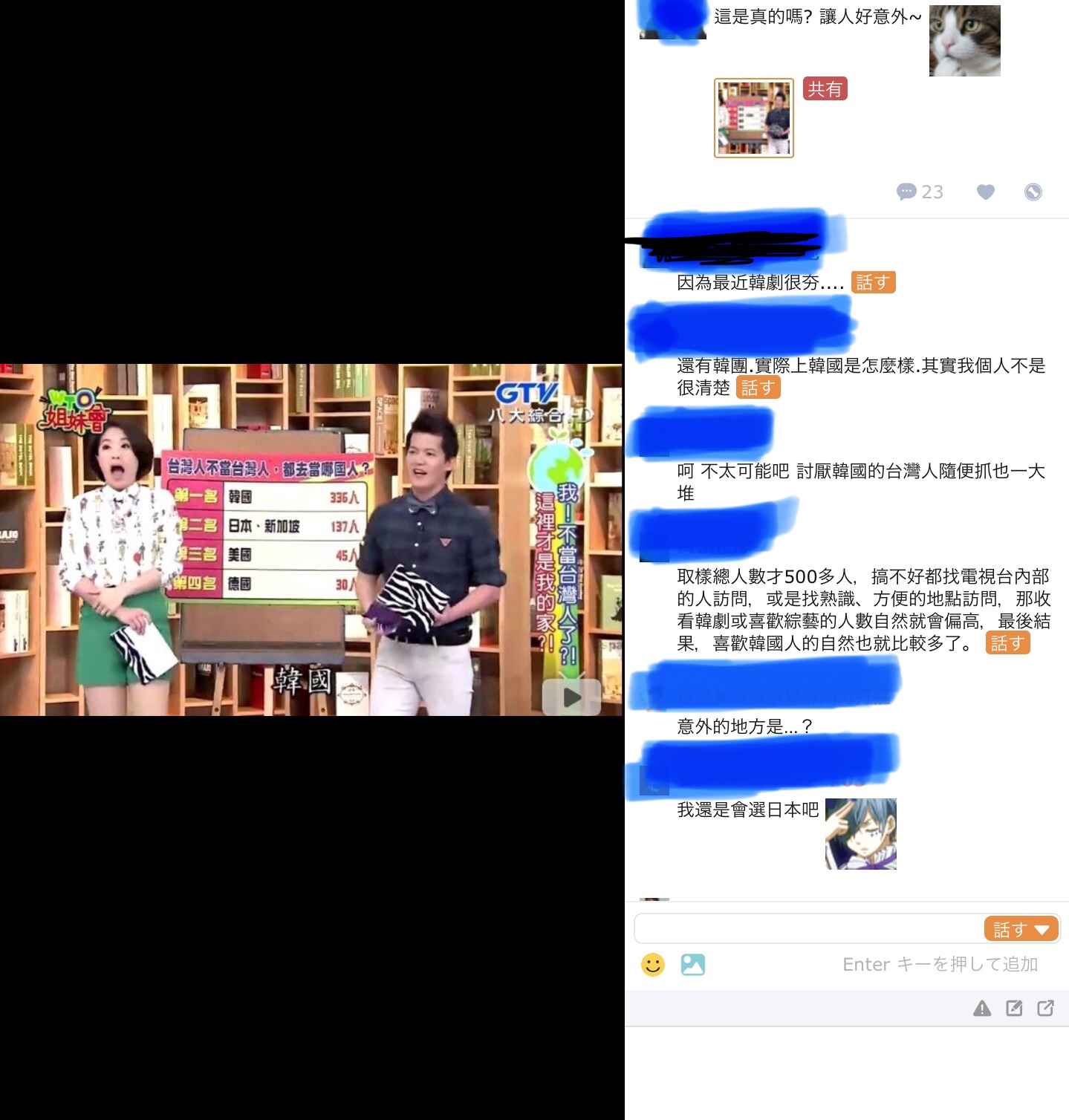 「ありえねーわ」「台湾のメディアなんか信じるな」「自分は日本を選ぶ」「まぁ中高生には韓流人気もあるし多少はね」とか書いてあるらしい>>115