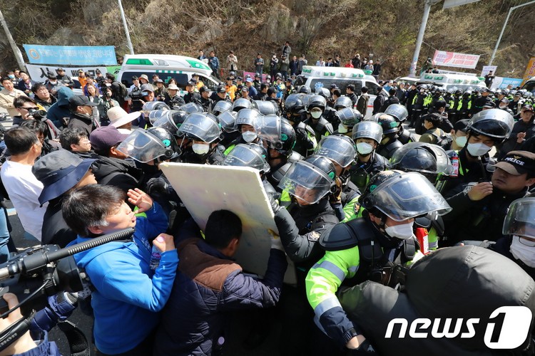 【城主=ニューシス】ベソヨウン記者=国防部が12日午前10時34分頃、慶尚北道星州サド(THHAD・高高度ミサイル防衛システム)の基地施設工事に使用する工事機器や資材を載せた車両搬入などをしようとする過程で、住民と衝突をもたらした。