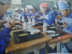 >>38越前漆器の碗や、お盆を使う子供達。皿は樹脂製だが、漆加工されている。(福井県鯖江市の市立河和田小学校で)