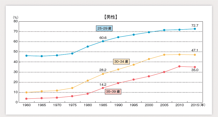 30代前半(30-34歳)の男性、その47.1%が結婚したことがない。