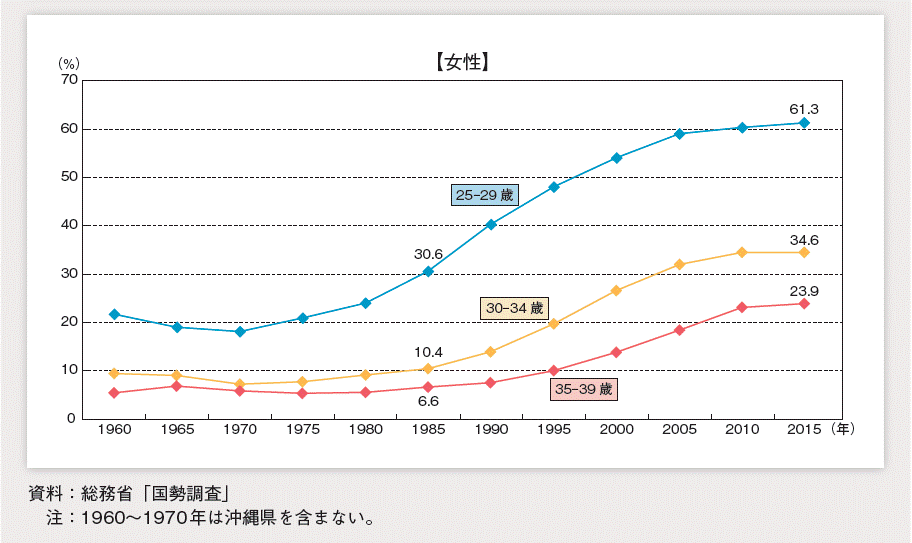 30代前半(30-34歳)の女性、その34.6%が結婚したことがない。>>20
