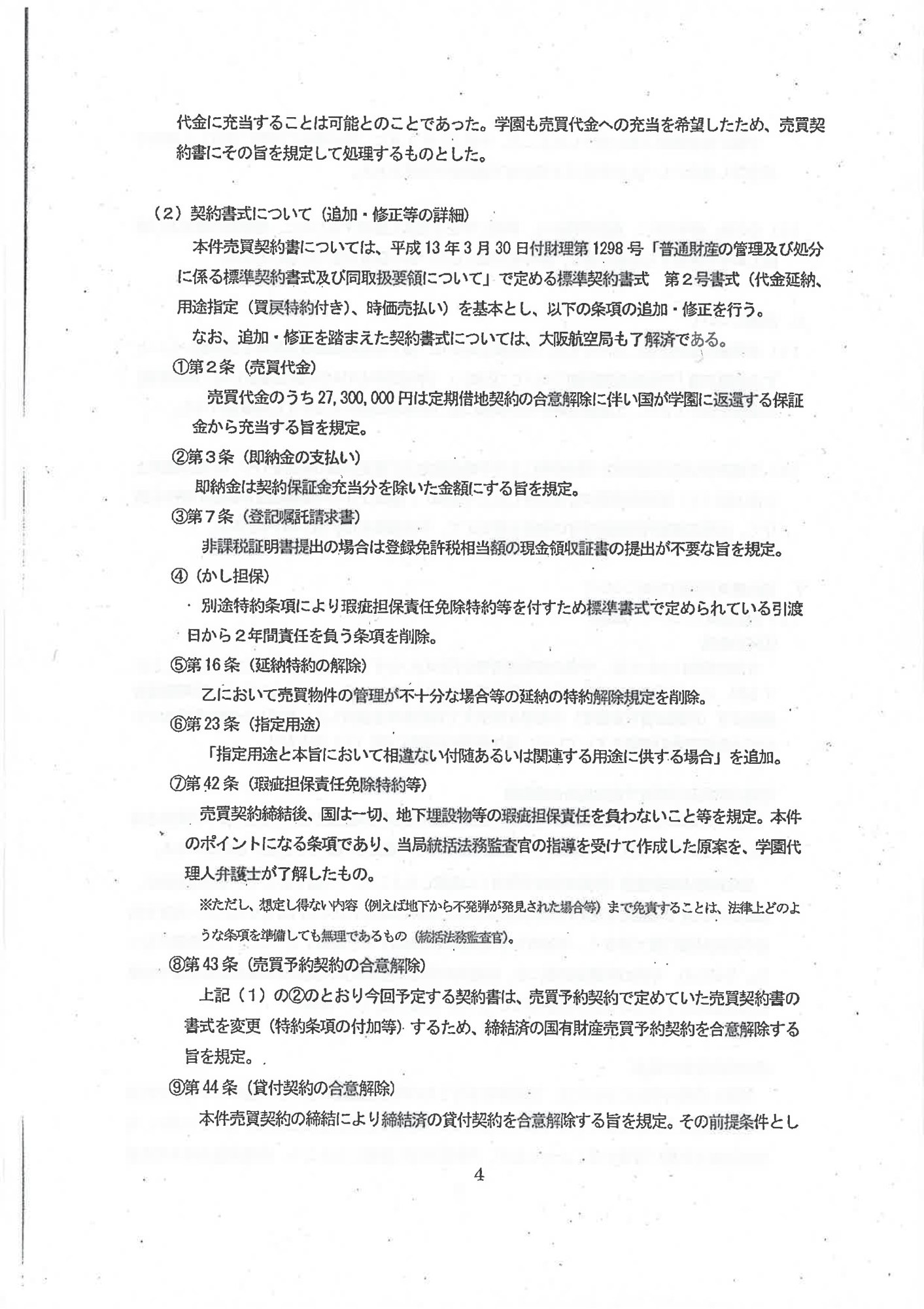 この特約を結ぶ経緯については、改ざん前(経緯の削除)の文章の方が多くの情報がある。そして、訴訟リスクの大きさを恐れていたのかを理解を得る為に、補足情報が非常に多い。追加のゴミが出てきた事で、籠池は訴訟をちらつかせて値引きを迫った。削除された文章には、籠池が、保守団体、政治家、安倍首相夫人等の関係をちらつかせていた。また当時野党であったが、保守系の政治家の名前まで載っていた。削除されたのは、当事者以外の個人名の部分。この内容を読めば、籠池が提訴した場合に、通常の土地取引以外の問題に巻き込まれるリスクを懸念しなければならない様子が判ります。ただ、実態は「虎の威を借りる狐」ですがね。籠池の行動は、暗黙の内に「問題を大きくしたくないのであれば、値引きに応じろ!」と恫喝していたに等しいが、その恫喝に屈したとも言える。この部分は、近畿財務局の問題より、航空局から引き継いだ「埋設ごみ」の量的情報を信じて、初期の契約書に記載していた範囲より大きな範囲でゴミが出てきた事が起因している。結果、籠池に付け入る原因を与えたのは、近畿財務局ではなく航空局ともいえる。この点、近畿財務局は板挟みともいえる状況で、訴訟された場合の責任分界点は、航空局とも関係する為、かなりややこしい。