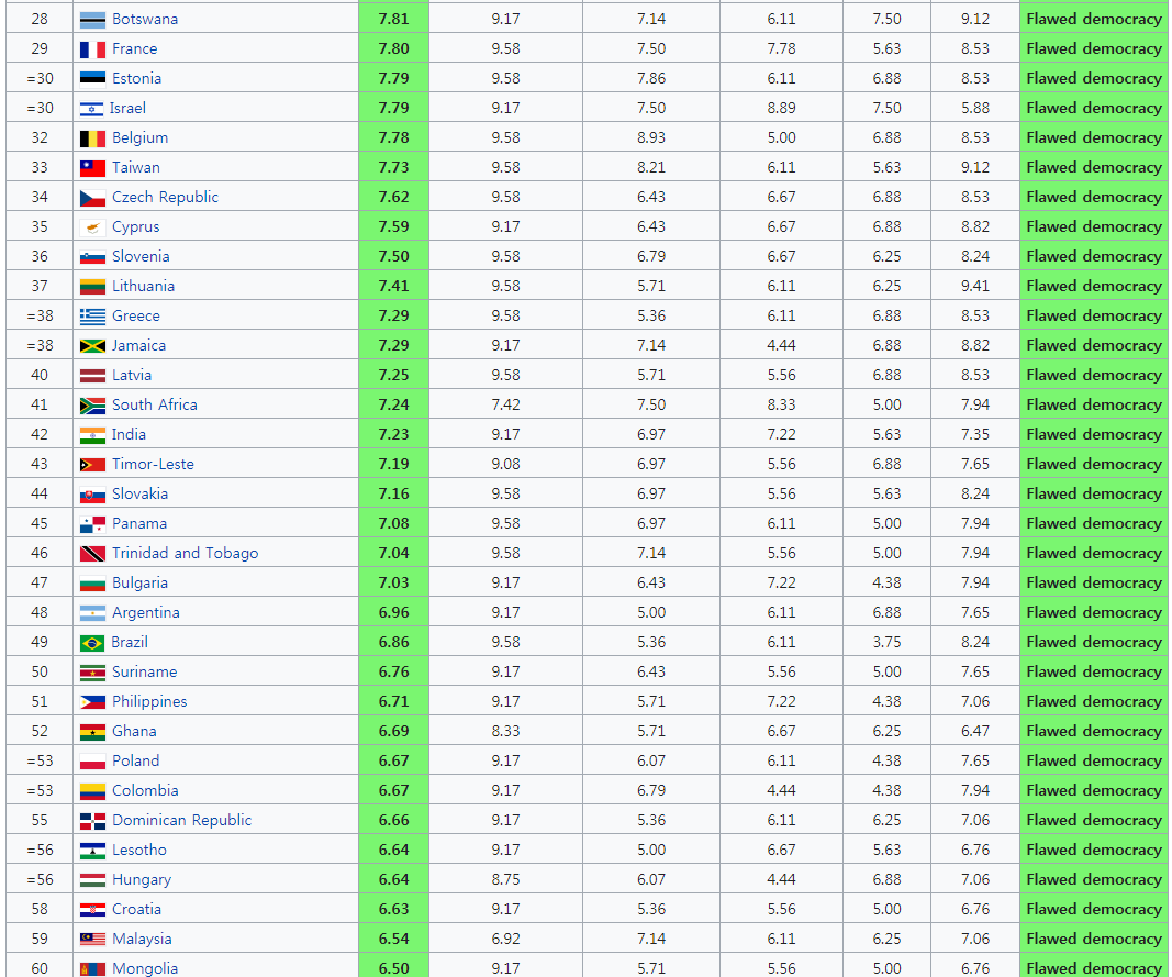 다섯가지 항목으로 이루어진 지수에서 전세계 167개국 중에서 한국은 8.0 (20위) 이고, 미국은 7.98 (21위), 일본은 7.88 (23위) 인데, 상위에 마우리티우스(16위)나 몰타(17위)도 있으니, 순위 자체는 준수한 편이며, 한국과 일본의 근소한 점수 차이가 있는데, 개인적 평가로는 시민정치참여 부분에서 일본의 평균점수가 좀 깎였을 뿐, 대부분 항목에서 우수하다는 걸로 볼 때, 일본의 민주주의 실력을 과소평가 해서는 안된다고 봅니다. 그 항목을 빼면 일본이 더 높기에 어떤 시각에선 더 훌륭하다 볼 수도 있고요. 다만, 이 지수 상에서는 한국이 근소하게 많은 점수를 받았으니, 일본인은 과도한 기쁨은 자제하시고,(ww) 카이카이 민(카민)이 지수를 그저 참고로만 하시길.>>16