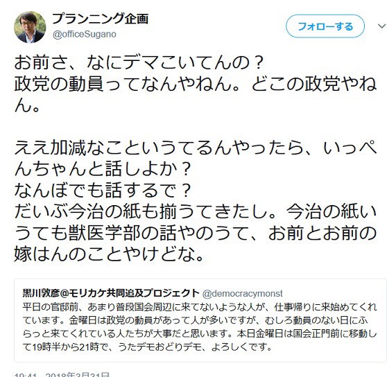 黒川と言う極左が、普段デモは政党の動員で人が集まっている事、今回はそれが移動して集まった事、一部一般人が来てくれてうれしいということを書いている。
