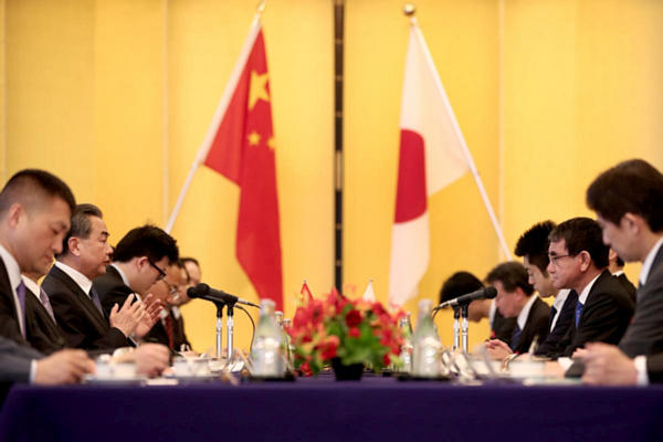 王外相は会談の冒頭、「今回の訪日は、河野大臣、そして大臣の前任の何回かの訪中の答礼訪問でもあり、日本側が前向きな対中政策を取ったことへの答えでもある」と発言。「両国関係を持続的、安定的に改善させ、早期に正常発展の軌道に戻していきたい」と語った。