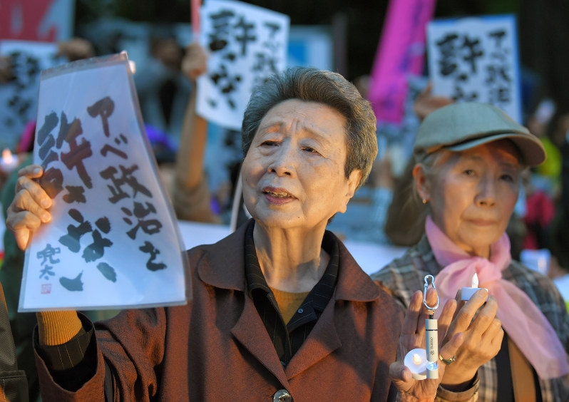 最近安倍首相は、大阪にある国有地をした私学財団の安値で売りた政治不正事件に巻き込まれた。これだけでなく、安倍首相は、多くの反対にも憲法9条を直し多くの反発を受けた。複数疑惑と独断的な政治行為で3万人を超える市民が東京永田町の国会議事堂の前に集まって、大規模な集会を開いた。