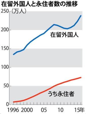 在留外国人はリーマン・ショックの影響などで09年から減少し、13年に増加に転じた。16年末は国別で(1)中国(69万5522人)(2)韓国(45万3096人)(3)フィリピン(24万3662人)(4)ベトナム(19万9990人)の順。一方、永住者はその間も一貫して増加。16年末の国別は未集計だが、15年末は(1)中国(22万人余)(2)フィリピン(12万人余)(3)ブラジル(10万人余)(4)韓国(6万人余)の順だった。