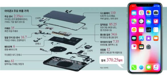 글로벌 시장조사기관 IHS 마킷(Markit)은 8일(이하 현지시간) 아이폰X를 분해한 뒤 장착된 부품류의 가격을 측정하고 아이폰X의 제조원가는 370.25 달러(약 41만4,532원)이라고 발표했다.