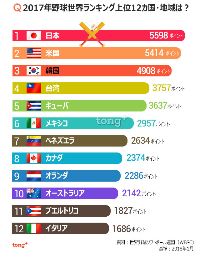2017年野球世界ランキング1位は5598ポイントを獲得した日本だった。米国は5414ポイントで2位、韓国は4908ポイントで3位に入り、前年度と同じ順位だった。