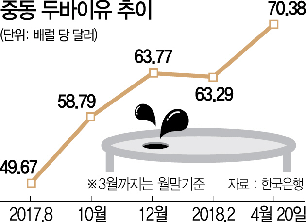 23日、韓国石油公社ペトロネットによると、20日ベースでドバイ原油の価格はバレル当り70.38ドルを記録した。 国際原油価格基準物のブレント油とウエスト・テキサス・インターミディエート(WTI)先物価格は最近、それぞれバレル当たり74ドル、68ドルを上回り2014年11月以降最高水準に到達した。 40ドル台を行き来していた昨年夏と比較すると、すべて60%以上値上がりしたわけだ。