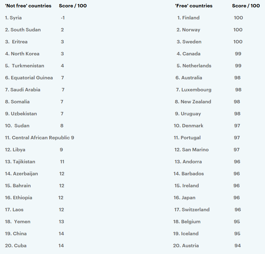 フリーダム・ハウス・2018世界報道の自由度ランキング