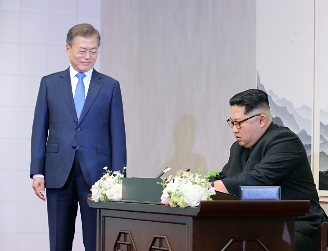 2018年4月27日、韓国・国民日報は、韓国の文在寅大統領と北朝鮮の金正恩朝鮮労働党委員長が首脳会談を行っている板門店の雰囲気を伝えた。