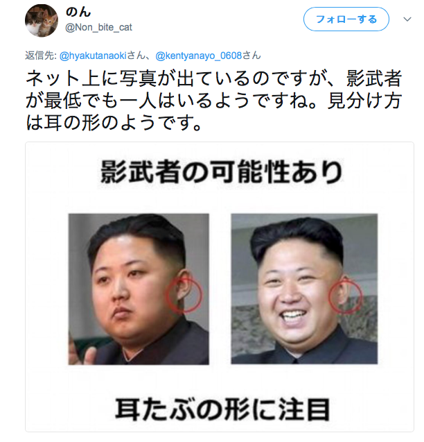 だから金正恩が「影武者」であろうが、本人は噂であった皮脂脂肪手術の失敗で、公の場に登場できない身体になっていようが、死んでいようが、金一族体制が形ばかりの北朝鮮のあの体裁でいる現役としての国家君主としての「顔」だけの存在でいることが望ましい公然の秘密というやつか(´・ω・`)