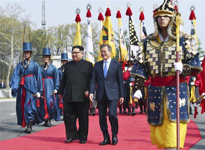 北朝鮮の金正恩(キム・ジョンウン)労働党委員長は27日、南北首脳会談に先立って、会談場たる板門店の「平和の家」前で韓国軍儀仗(ぎじょう)隊を査閲する。北朝鮮の指導者としては初めてだ。場所が狭いため儀仗隊の規模を縮小し、人共旗(北朝鮮の国旗)の掲揚や北朝鮮国歌の演奏はしないという。