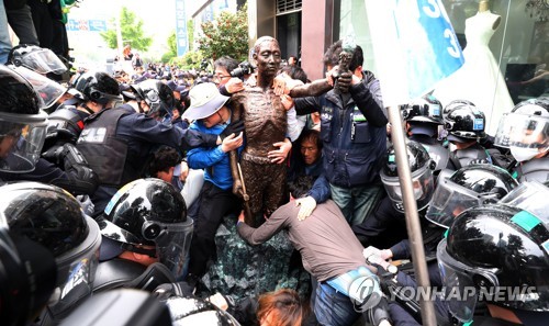 市民団体側は労働者の日を迎え、日帝ガンジョンギ強制徴用された労働者を記念する「強制徴用労働者像」を日本領事館の前に設置しようとしました。