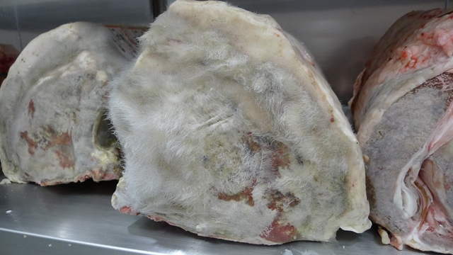 最近流行ってきましたが、画像のように赤身の固い肉を表面に黴が出るくらい乾燥熟成させて、柔らかくなった中身の部分をステーキなどにする牛肉です。(外側の黴が生えた部位は食べませんよ)
