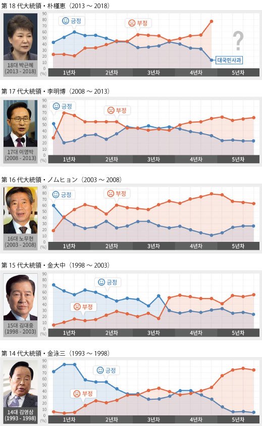就任1年目の支持率としては歴代大統領を大きく上回っている。盧泰愚(ノ・テウ)元大統領は45%(1989年1月)、金泳三(キム・ヨンサム)元大統領は55%(94年1月)、金大中(キム・デジュン)元大統領は60%(99年3月)、盧武鉉(ノ・ムヒョン)元大統領は25%(2004年3月)、李明博(イ・ミョンバク)元大統領が34%(09年2月)、朴槿恵(パク・クネ)前大統領は56%(14年2月)だった。