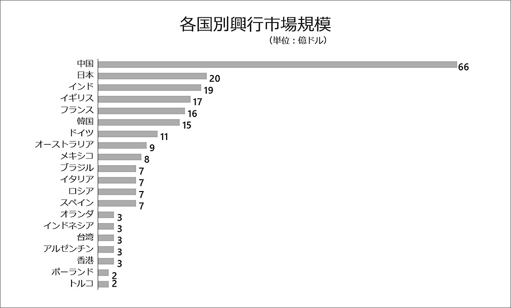 国別の興行収入を見ると、7か国で「10億ドル」を超えている。中国が66億ドル。トップ3か国とも東ユーラシア、「国際市場」の成長のドライバーは、アジア・太平洋地域。