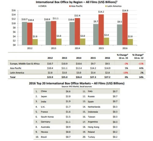 国別の興行収入を見ると、7か国で「10億ドル」を超えている。特に中国が圧倒的に強く、66億ドル。トップ3か国ともアジアであることから分かるように、「インターナショナル市場」の成長のドライバーは、アジア・太平洋地域から来ている。