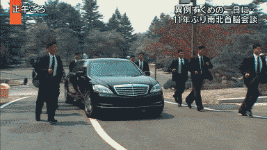 SPの事忘れてて車1台きたけど、将軍様に文句言えないから走ったと推測。SP「ちっ、このくらいの距離歩けよ、デブ。」