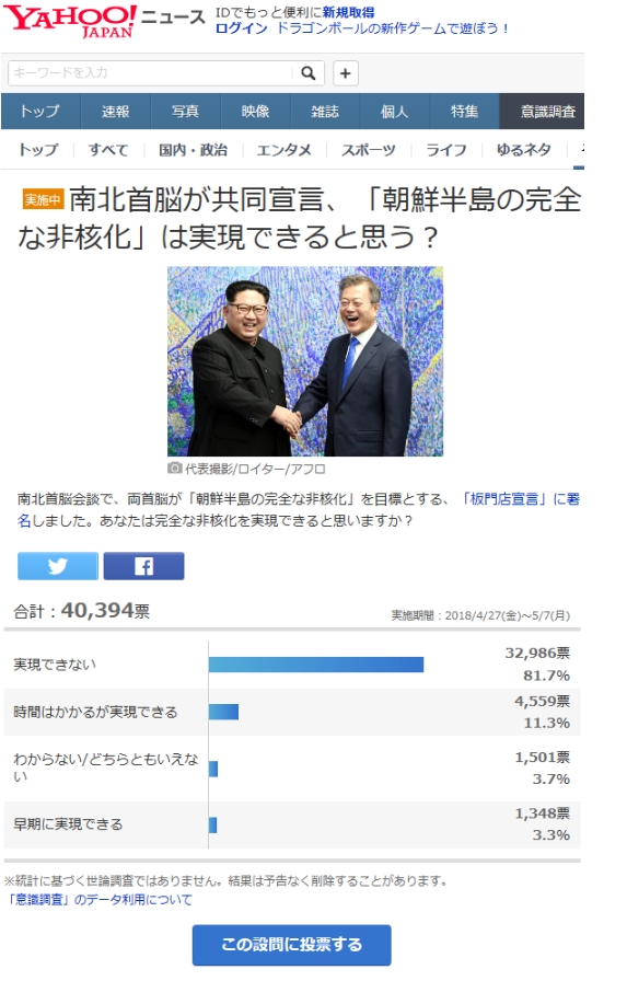 タイトル「南北首脳が共同宣言、「朝鮮半島の完全な非核化」は実現できると思う?」