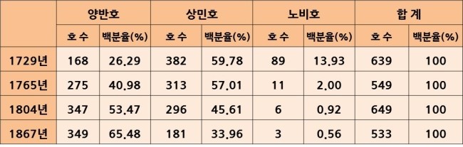 보시다시피 4기인 1858년에 이르면 양반이 차지하는 비중이 70%를 넘어갑니다. 단, 이는 어디까지나 대구 지역의 통계로, 다른 지역세서도 양반층의 증가는 나타났지만 비율상으로는 차이가 있습니다. 아래 울산에서의 호구 통계를 이를 보여주고 있죠.