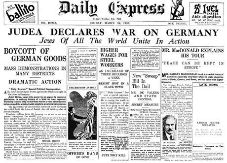 ドイツはイギリスの新聞"Daily Express"で1933年3月24日にユダヤ人から宣戦布告を受けたんですけどスレタイの例えは分からないけど、親中親北で反米反日の韓国はイスラエルの天敵である事は確か。