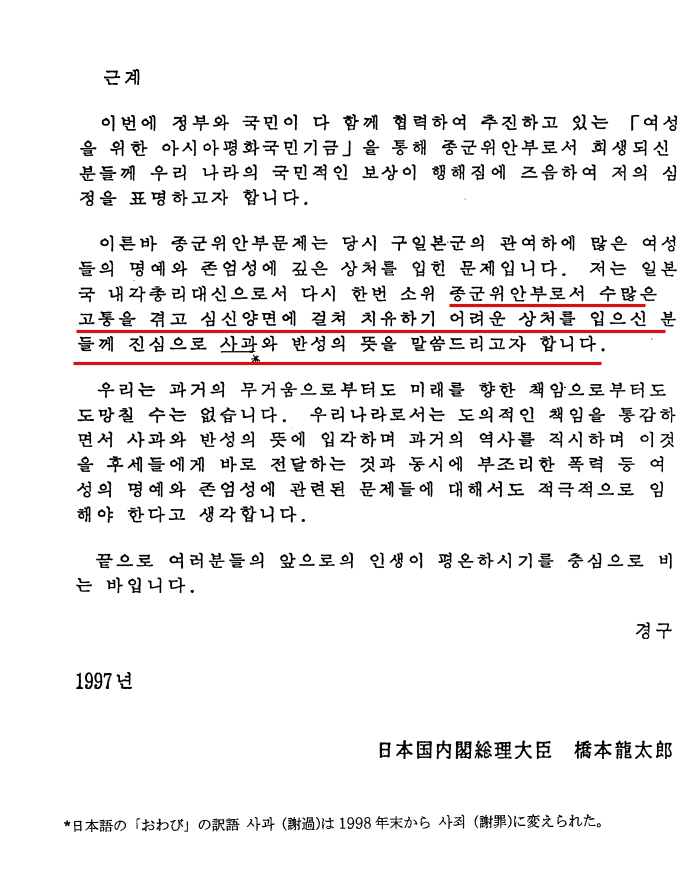 '여성을 위한 아시아 평화 기금'(이하 아시아여성기금 혹은 아시아기금)을 수령한 한국인 피해자들에게 전달된 사죄 서한이다.