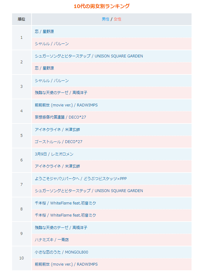それに対して日本でのランキング(カラオケの鉄人年間ランキングにて)