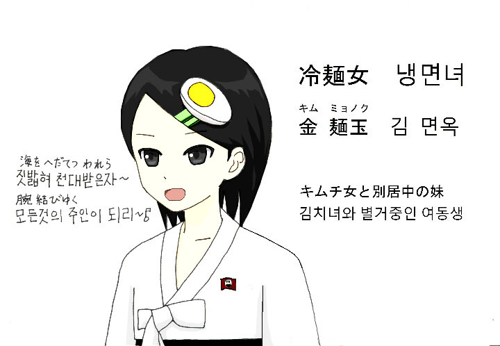そこで、「寿司女」や「キムチ女」のキャラクターを、一緒に作っていきませんか? 絵が上手い人でも下手な人でも(実際私も上手くはありません)、イラストを描いていったり、絵が描けない人でも、設定を練り上げたり、SS(Short Story)を書いたりするわけです。>>977