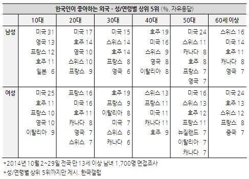 갤럽은 "미국은 10대(28%)와 50대 이상(20%)에서 비교적 높은 선호도를 기록했고 호주는 30대(17%)에서 가장 좋아하는 나라로 꼽혔다"며 "프랑스는 남성보다 여성에게 더 인기였다"고 분석했다.