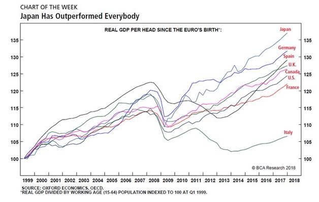 日本の労働年齢あたりのGDP伸び率は他の国と変わらないレベルみたいだよ