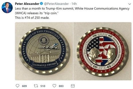 21日(現地時間)時事週刊誌タイム(TIME)など米メディアによると、この日のホワイトハウス通信局(WHCA)はホワイトハウスが製作した米朝首脳会談記念コインを公開した。