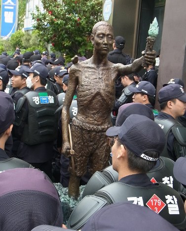 日本による植民地時代に朝鮮半島から強制徴用された労働者を象徴する像が釜山の日本総領事館近くの路上に置かれている問題で、路上を管轄する釜山市東区と総領事館前への設置を目指す市民団体の対立が続いている。