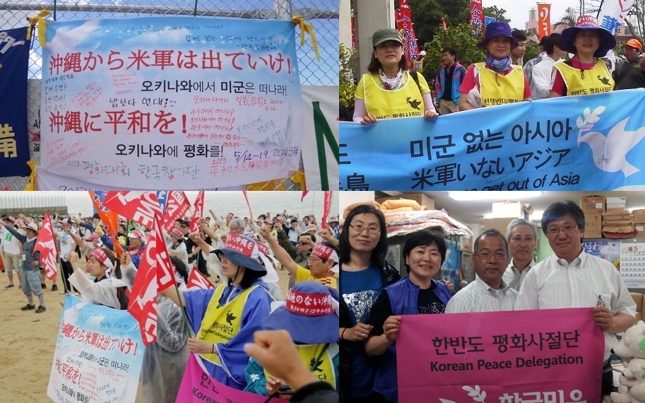 「韓半島平和使節団」ですね。>>12のプラカードを掲げて沖縄の反基地デモに参加していた韓国系団体です。