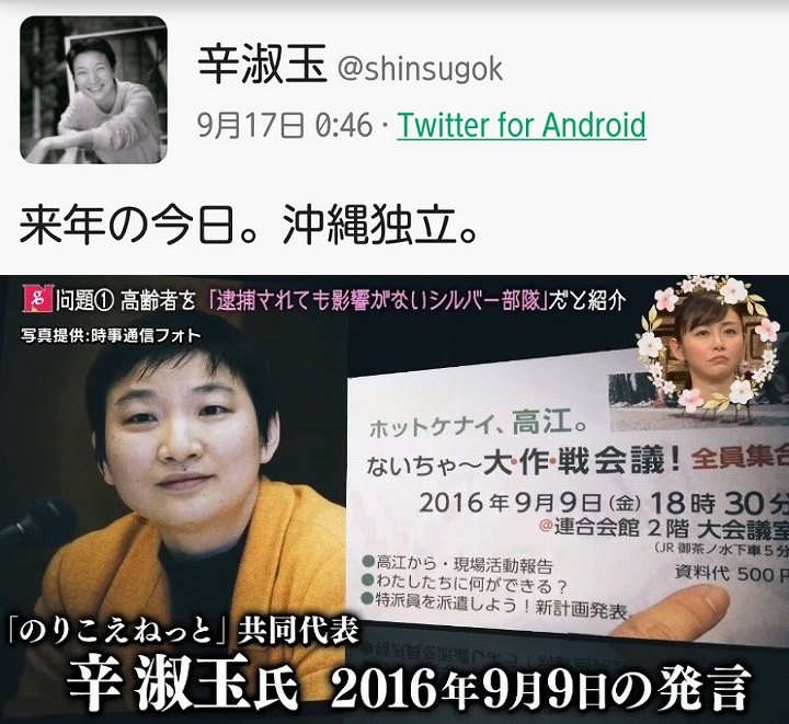 辛淑玉、沖縄反基地活動で高齢者への犯罪教唆