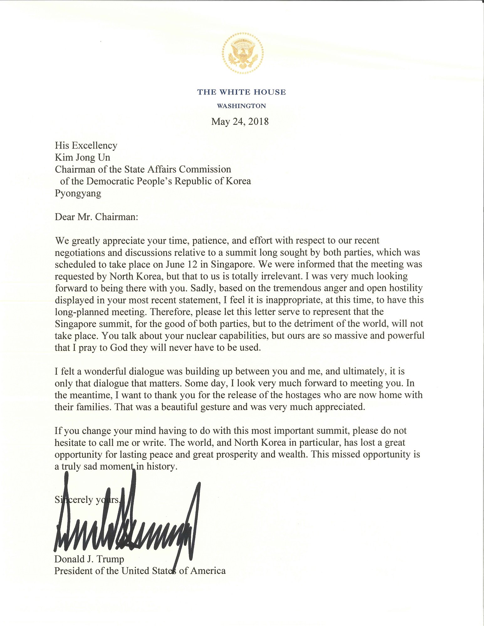 この最も重要なサミットに関して心変わりがあったら、遠慮なく電話するか手紙を寄越すかしていただきたい。世界は、そして特に北朝鮮は、恒久的な平和や偉大な繁栄と富を得る機会を失ったのだ。この失われた機会は歴史上、真に残念な時間であった。