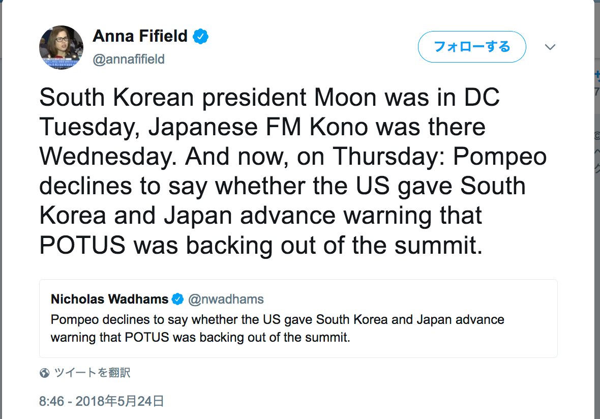 アメリカが軍事カードを切ったら、「平和的解決を望んだ中国」と「圧力だけで終わらず軍事力まで行使したアメリカ」というイメージを作り出せる。民主主義国家が多い現代社会では、実態がどうなのかではなく、イメージ戦略が重要。特にリベラルな空気の強い欧州ではアメリカに反対する動きが出てくる可能性がある。北朝鮮が戦争で負けても、その後の国際社会でアメリカの発言力を弱め、中国の発言力を高めることができる。South Korean President Moon was in DC Tuesday and Japanese FM Kono was there in Wednesday. And now, on Thursday: Pompeo declines to say whether the US gave South Korea and Japan advance warning that POTUS backing out of the summit.