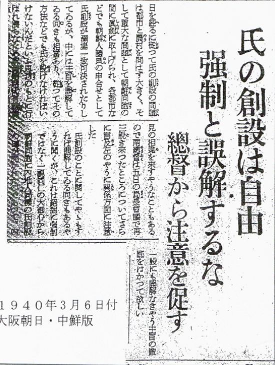 しかし、朝鮮社会で'日本の名前を自称するようなありがたい法律ができた恩に報いるために、村と村ごとにすべて日本名にしようと'は運動が起きて慌てた朝鮮総督府は登録期間中、3度'強制がない'と注意しています。 日本が朝鮮人に日本の名前を強制するはずがないです。 下記の新聞記事もそのことを明確に証明しています。