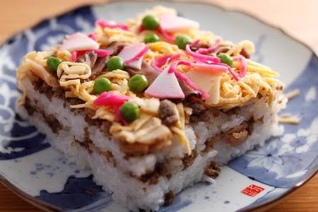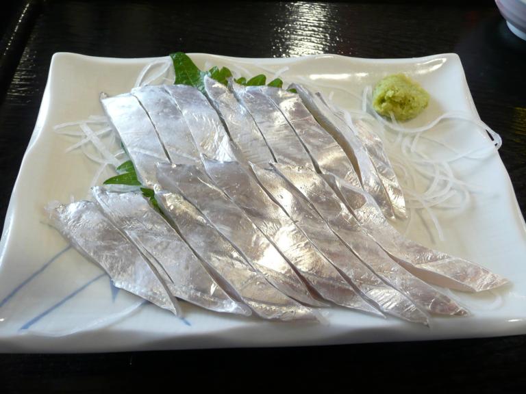幼魚のドロメの酢味噌にノレソレと言うアナゴの幼魚、チャンバラ貝と言う刀を持っていて、チャンバラをする貝、亀の手(ビスケー湾に面したスペインでは高級な貝)、ハガツオの刺身、魚のすり身の天麩羅、魚の棒寿司、箱寿司、姿寿司、更に海苔では無く薄焼き玉子で巻いた黄色い巻き寿司も有ります。