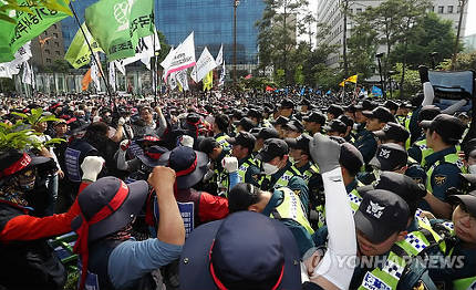 (ソウル=聯合ニュース)ギムギフン記者=全国民主労働組合総連盟(民主労総)が28日、ソウル汝矣島国会前の最低賃金算入範囲の拡大に反対する大規模な集会を開き、国会に進入しようとして警察と衝突した。警察は、現場での暴力を行使した組合員1人を逮捕するなど、双方の衝突は、時間が経つにつれ、激化する形だ。