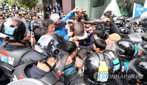 労働組合などでつくる市民団体は、総領事館前にすでに設置されている慰安婦問題を象徴する「少女像」の横に徴用工像を置き、日本に謝罪を求めるのが目的。4月30日夜に像を総領事館前に運ぼうとして警察と衝突し、歩道上に放置した。像はその後、警察が常駐して警備している。