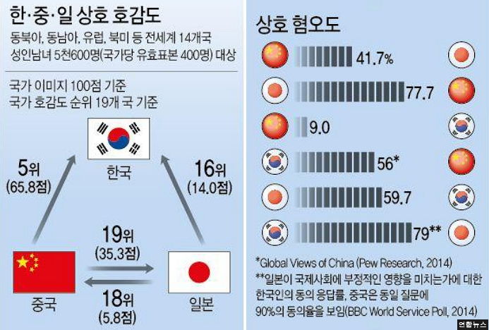 일본 국민의 14%만 한국에 대해, 5.8%만이 중국에 대해 호감을 표했다. 중국 국민의 경우 65.8%가 한국에, 35.3%가 일본에 호감을 드러냈다.