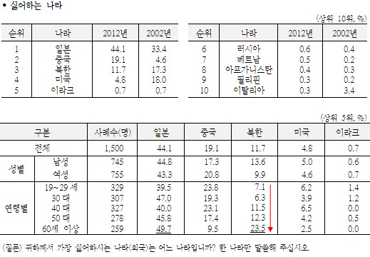 이어 상대국에 대한 낮은 호감도는 혐오도에서 그대로 나타났다.