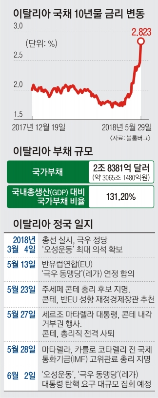 이탈리아의 10년 만기 국채 금리는 29일(현지시간) 연 3.18%로 0.51%포인트 급등했다. 2014년 4월 이후 4년여 만의 최고치다. 장중 한때 연 3.3%를 넘기도 했을 만큼 투매 경향이 강했다. 유로존(유로화 사용 19개국) 내 안전자산으로 인식되는 독일 국채와의 금리 차이(스프레드)는 2.92%포인트로 확대됐다.