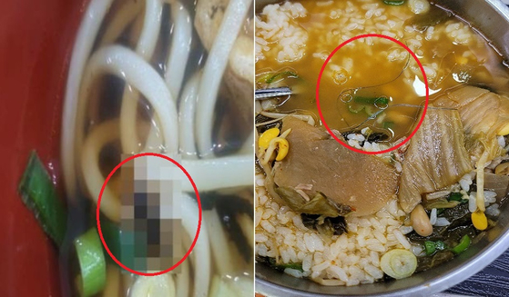 2023年8月に聞慶サービスエリアで販売されたうどんから発見されたコオロギ(左)、2023年10月に安城サービスエリアで販売されたクッパに入っていたひも(右)。