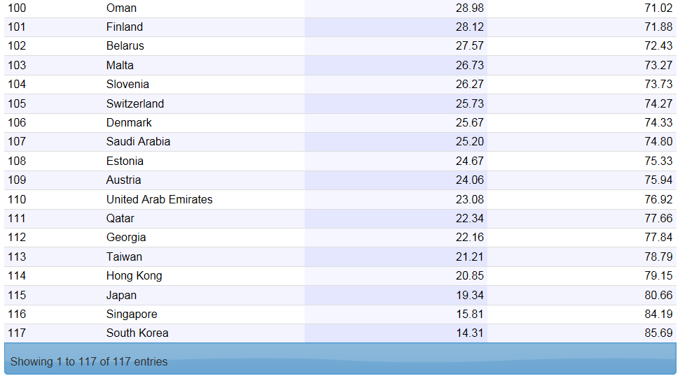 韓国は5.45点で61位となり、日本は6.05点で22位、中国は5.47点で58位となった。