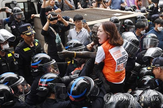 労働者像が強制撤去される過程で市民団体と警察が衝突した。
