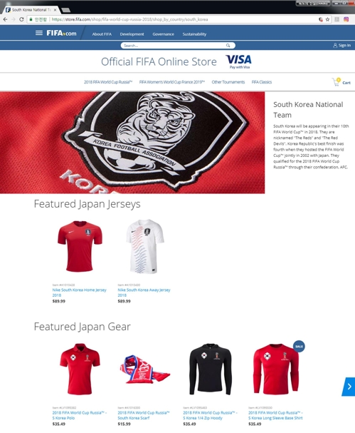 서경덕 성신여대 교수는 31일 "한 네티즌의 제보로 한국팀 유니폼 판매 페이지를 방문하니 'Featured Japan Jerseys'(일본 국가대표 유니폼)와 'Featured Japan Gear'(일본 국가대표 응원복장)로 잘못 소개한 것을 확인할 수 있었다"고 밝혔다.
