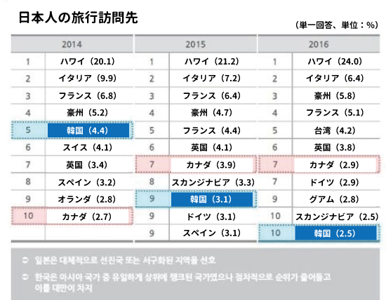 特に台湾とハワイは増えてる。今現在、嫌韓を抜きに考えても、韓国に行きたいと思わせるものが何もない。